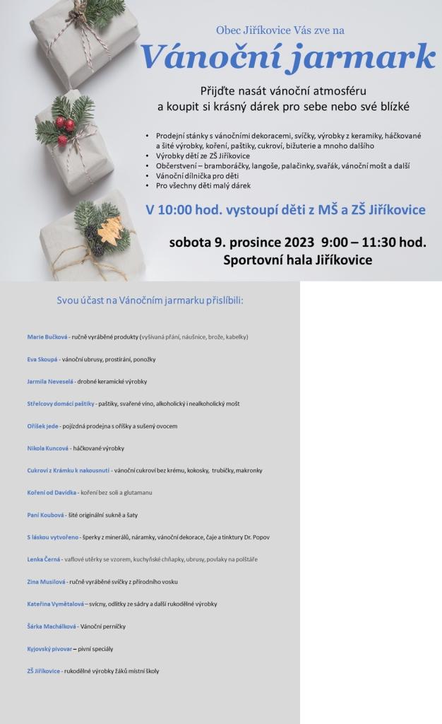 Obec Jiříkovice pořádá v sobotu 9.12.2023 od 9:00 do 11:30 hod. ve sportovní hale Vánoční jarmark.