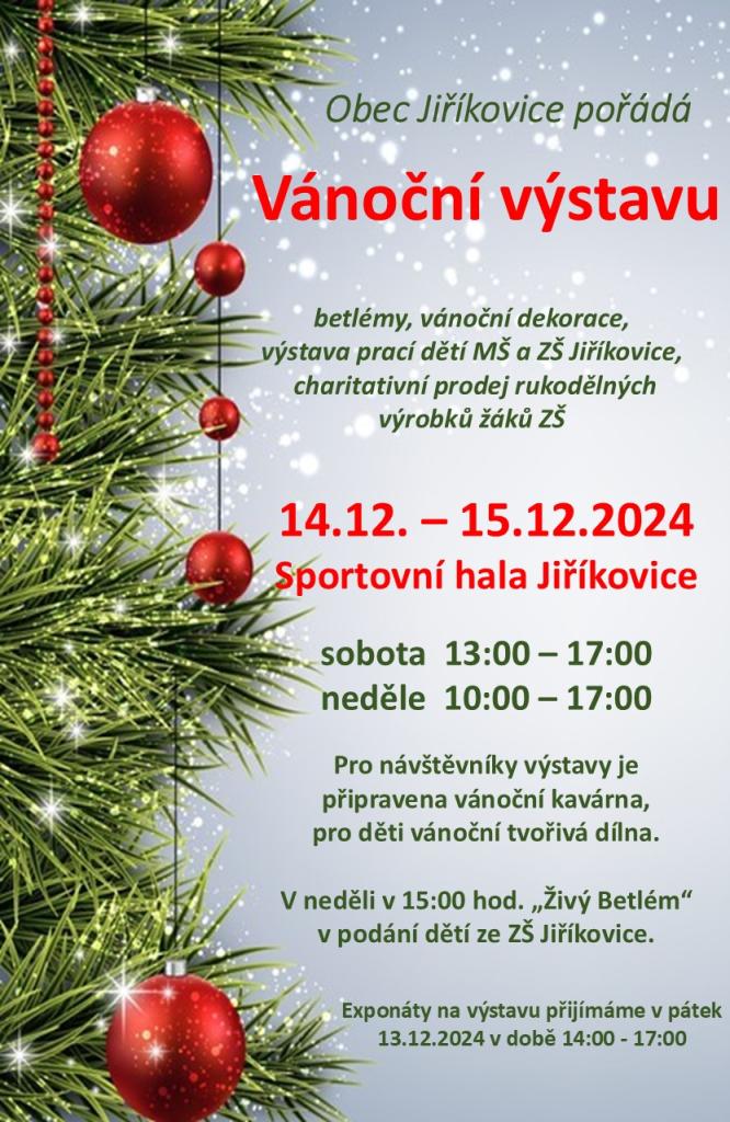 Obec Jiříkovice pořádá ve dnech 14. a 15.12.2024 Vánoční výstavu betlémů, vánočních dekorací a prací dětí z mateřské a základní školy. Pro návštěvníky bude připravena tradiční kavárna, charitativní prodej rukodělných výrobků žáků ZŠ, pro děti tvořivá dílnička. V neděli v 15:00 hodin představí děti ze ZŠ Jiříkovice „Živý Betlém“. Výstava se koná ve sportovní hale.
