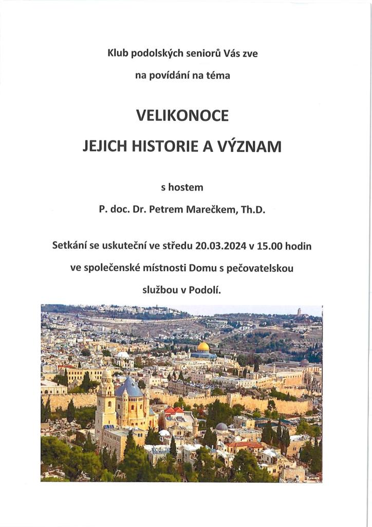 Klub podolských seniorů Vás zve na povídání na téma Velikonoce - jejich historie a význam. Hostem povídání bude P. doc. Dr. Petr Mareček, Th.D.