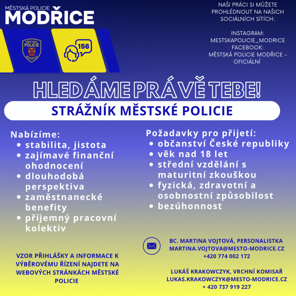 Město Modřice vydává v souladu s ust. § 4 a následujících zákona č. 553/1991 Sb., o obecní policii ve znění pozdějších předpisů výzvu k přihlášení zájemců na pracovní pozici: strážník Městské policie Modřice.