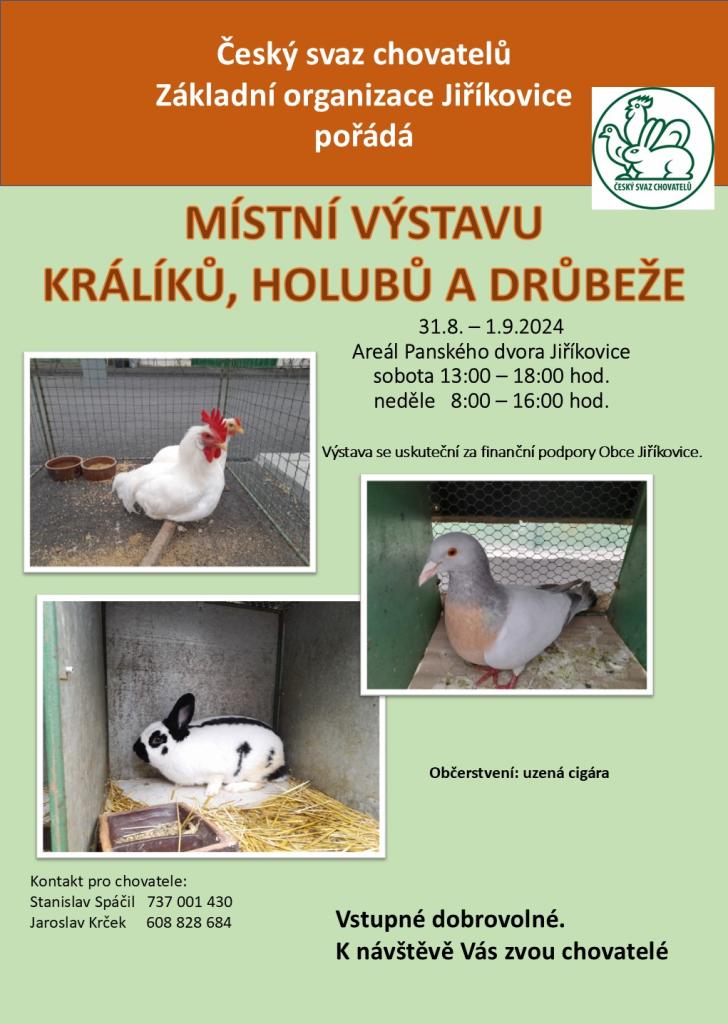 Základní organizace Českého svazu chovatelů Jiříkovice pořádá ve dnech 31.8. – 1.9.2024 v prostorách Panského dvora v Jiříkovicích místní výstavu králíků, holubů a drůbeže. Výstava je otevřena v sobotu od 13:00 do 18:00 hodin a v neděli od 8:00 do 16:00 hodin. Vstupné dobrovolné, občerstvení je zajištěno.