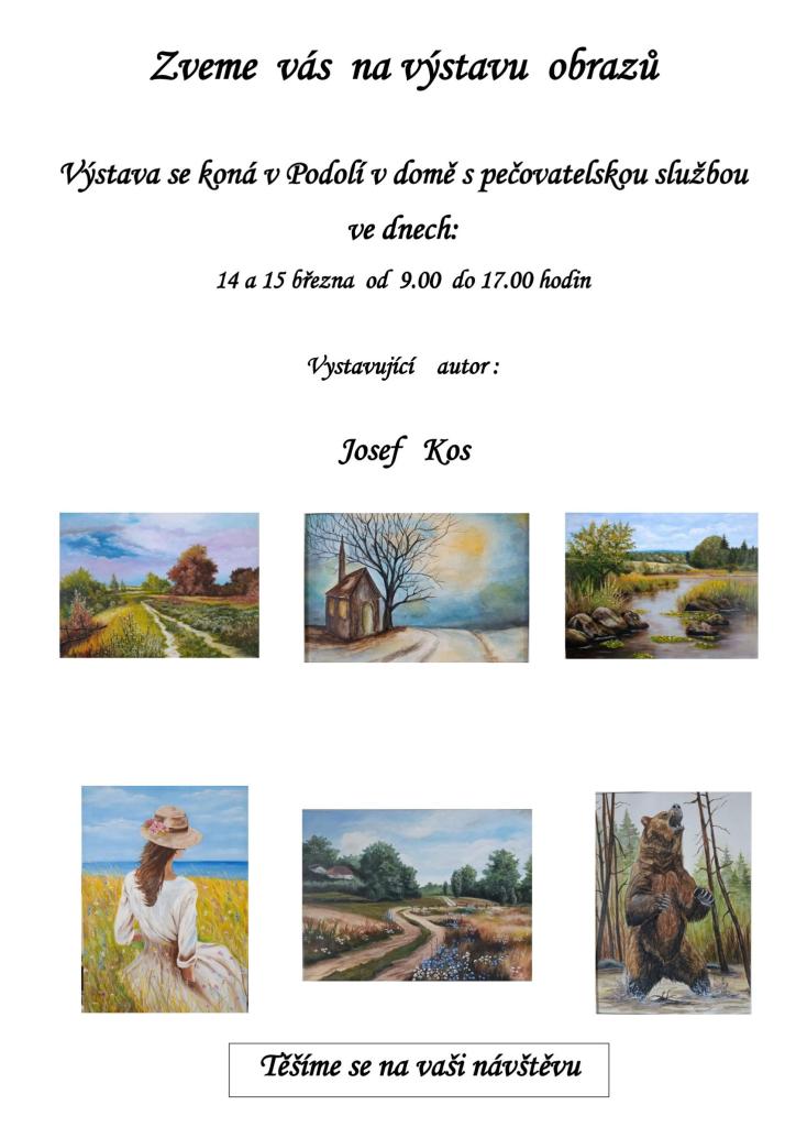 srdečně vás zveme na výstavu obrazů místního autora Josefa Kose, která se uskuteční ve dnech 14. a 15. března od 9.00 do 17.00 hodin v Domě s pečovatelskou službou v Podolí.