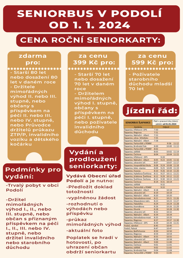 Od 1.1.2024 zahajuje v Podolí provoz seniorbus ze Šlapanic.