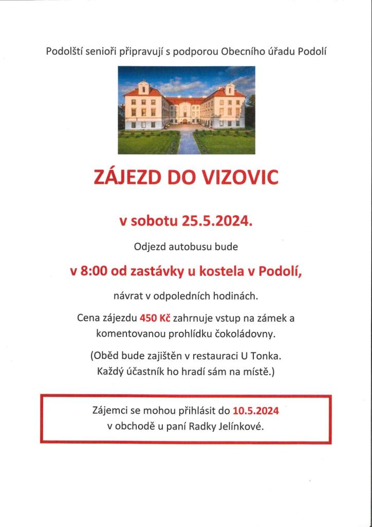 Podolští senioři připravují s podporou Obecního úřadu Podolí ZÁJEZD DO VIZOVIC.