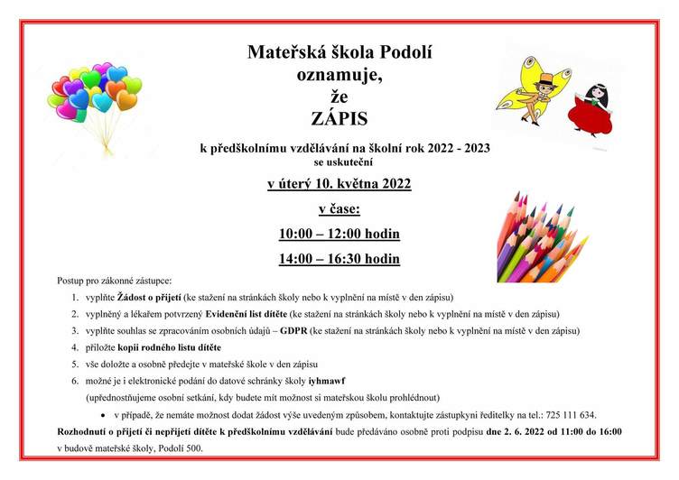 ZÁPIS k předškolnímu vzdělávání na školní rok 2022 - 2023