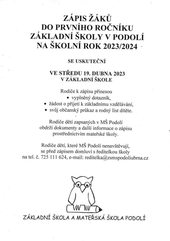 Zápis žáků do prvního ročníku základní školy v Podolí na školní rok 2023/2024 se uskuteční ve středu 19. dubna 2023 v základní škole. Podrobné informace a co si donést s sebou najdete .