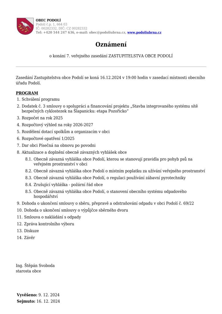 Návrh programu je zveřejněn na úřední desce obce Podolí nebo jej naleznete na webu obce v sekci Zasedání zastupitelstva obce.