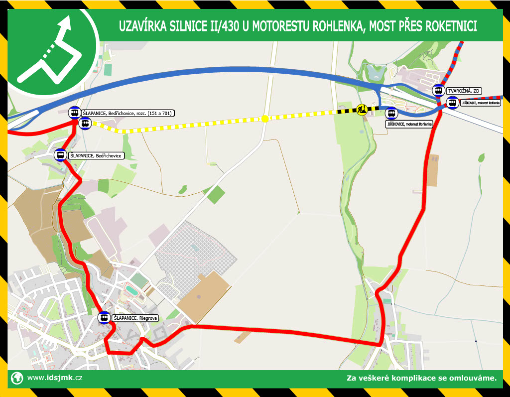 Linky 601, 602 a 702: Vybrané spoje jsou vedeny po objízdné trase přes Jiříkovice, Šlapanice a Bedřichovice, zde obslouží zastávky Šlapanice, Riegrova a Šlapanice, Bedřichovice. Ostatní spoje jedou mezi zastávkami Jiříkovice, motorest Rohlenka a Brno, Slatina, sídliště po D1.