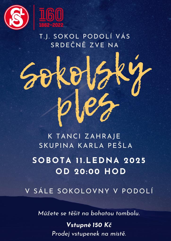 Sobota 11.ledna 2025 od 20:00 hod. v sále sokolovny v Podolí.