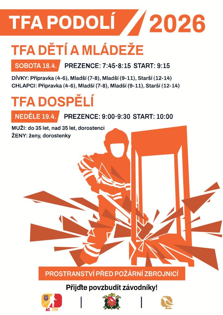 Sbor dobrovolných hasičů Podolí ve spolupráci s obcí pořádá v sobotu 18.4. od 9:15 a v neděli 19.4. od 10:00 na prostranství před požární zbrojnicí závody TFA Podolí.