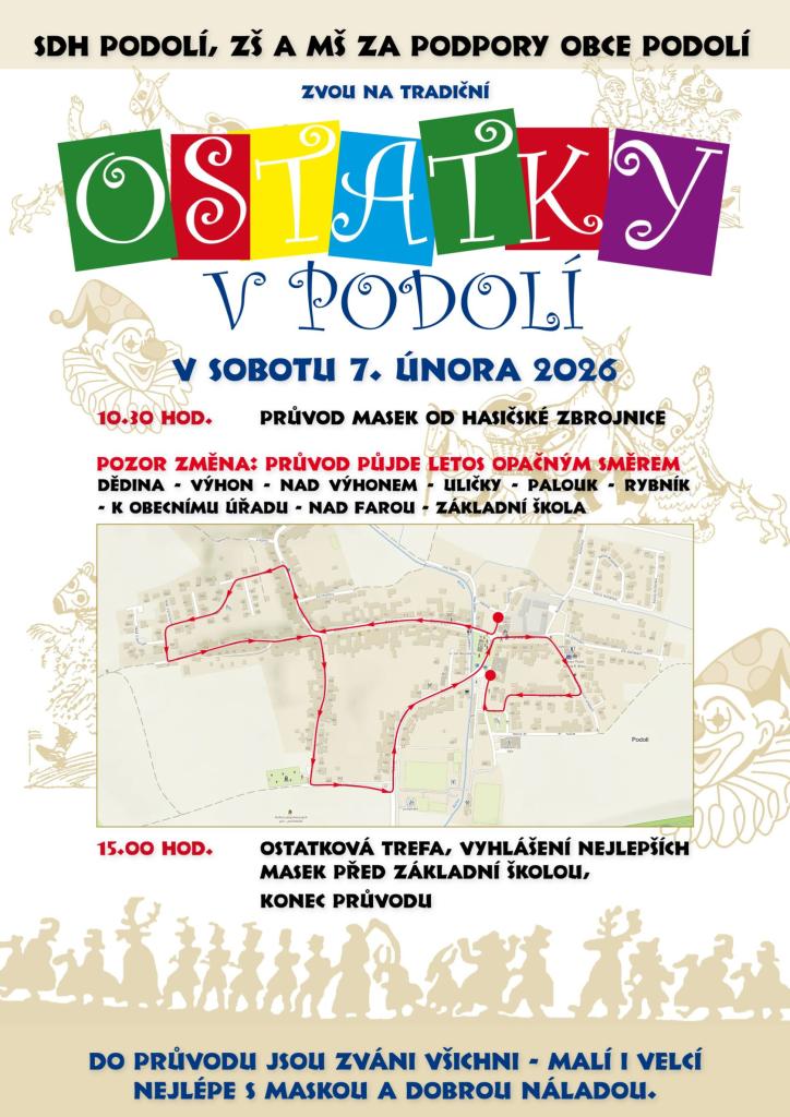 SDH Podolí, ZŠ a MŠ za podpory obce Podolí zvou na tradiční ostatky v Podolí v sobotu 7. února 2026.