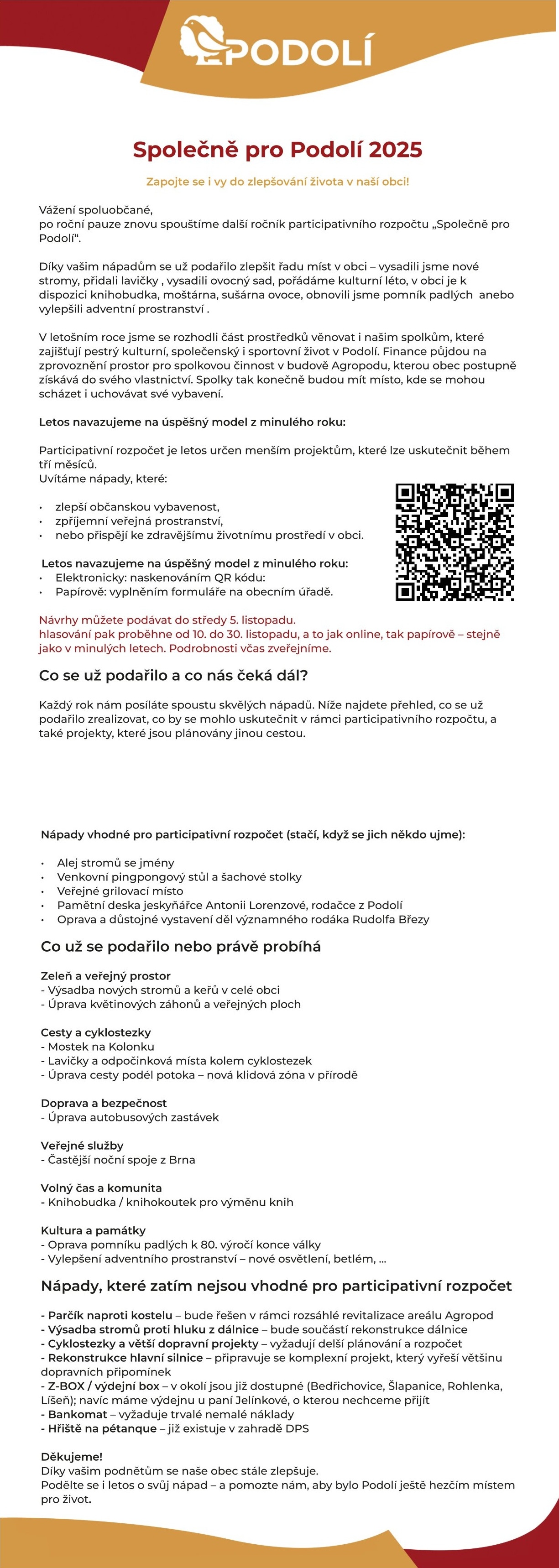 po roční pauze znovu spouštíme další ročník participativního rozpočtu „Společně pro Podolí“.